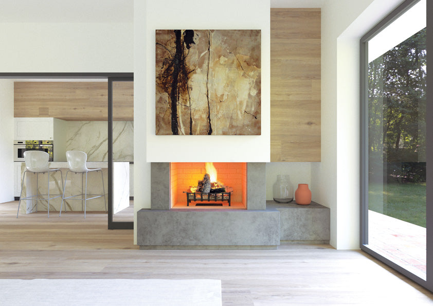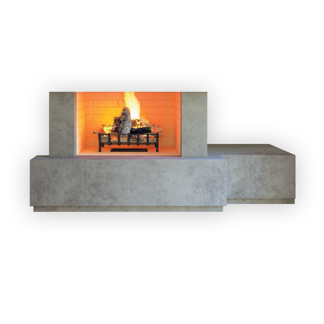 Disponibile di serie per i seguenti focolari: QR 100 TGH - QR 100 REF In foto basamento inferiore, panca, spallette e zoccolo interamente realizzati in Ceramica Cemento Grigio.