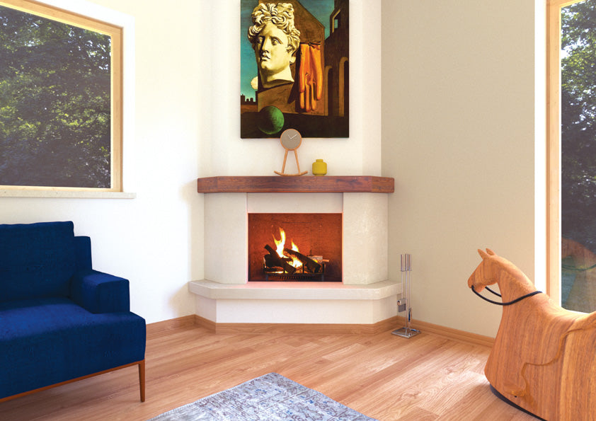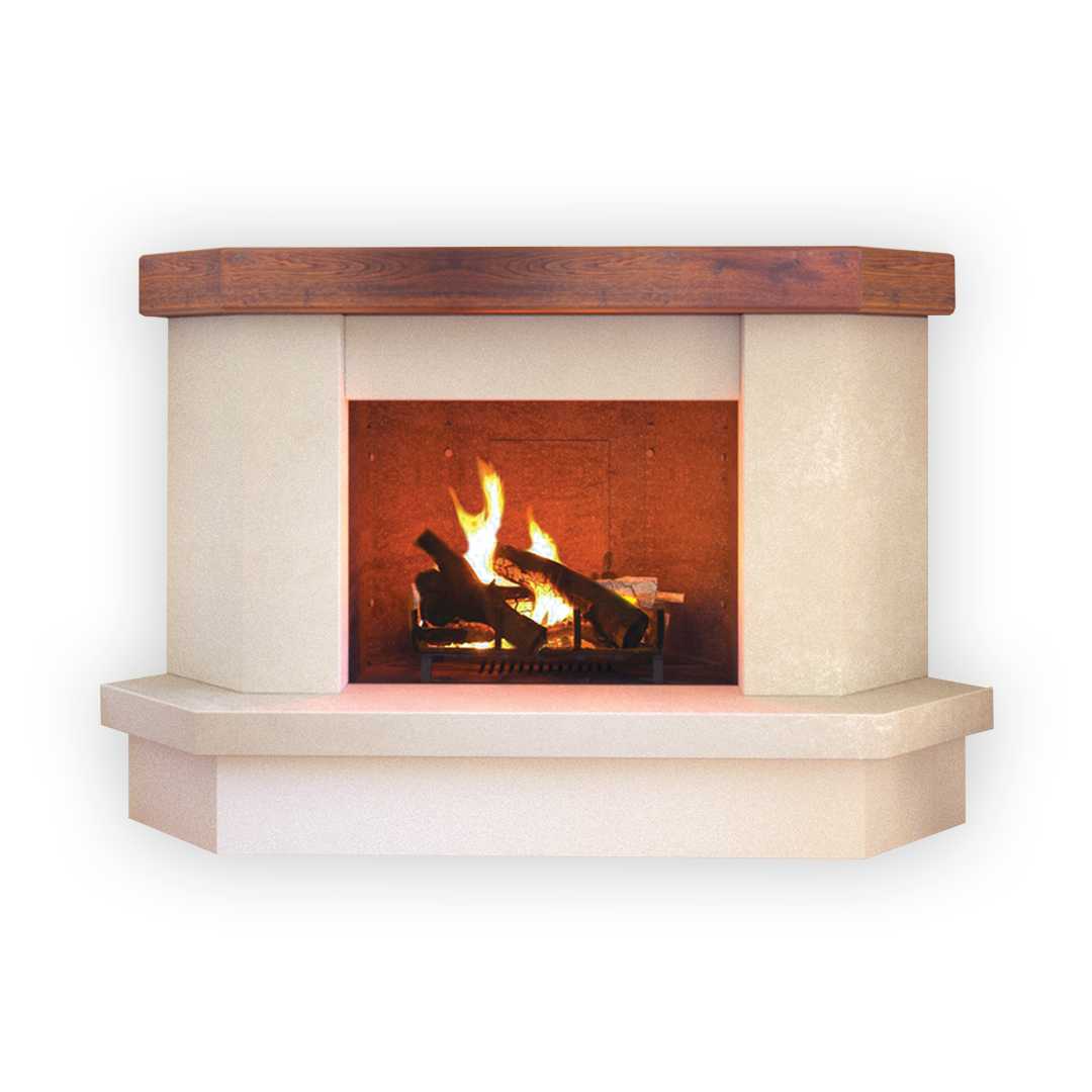 Disponibile di serie per i seguenti focolari: M 100 TGH - M 110 TGH - M 100 REF - M 110 REF In foto soglia inferiore, architrave e spallette realizzati in Ceramica Perla; Sottogrado con supporto di serie da rifinire e verniciare in opera; Mensola superiore in legno lamellare spessore 12 cm.