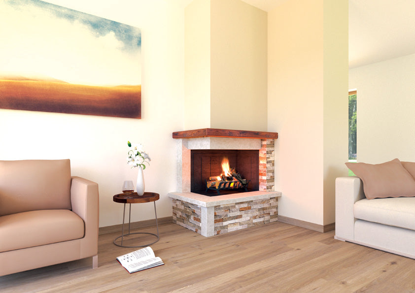 Disponibile di serie per i seguenti focolari: DS 70 TGH - DS 90 TGH - DS 100 TGH - DS 110 TGH - DS 70 REF - DS 90 REF - DS 100 REF - DS 110 REF In foto soglia inferiore, architrave, spalletta sx e particolari del sottogrado realizzati in Marmo Botticino anticato; Sottogrado e spalletta dx realizzati in Spaccato Misto; Mensola superiore in legno lamellare spessore 8 cm.