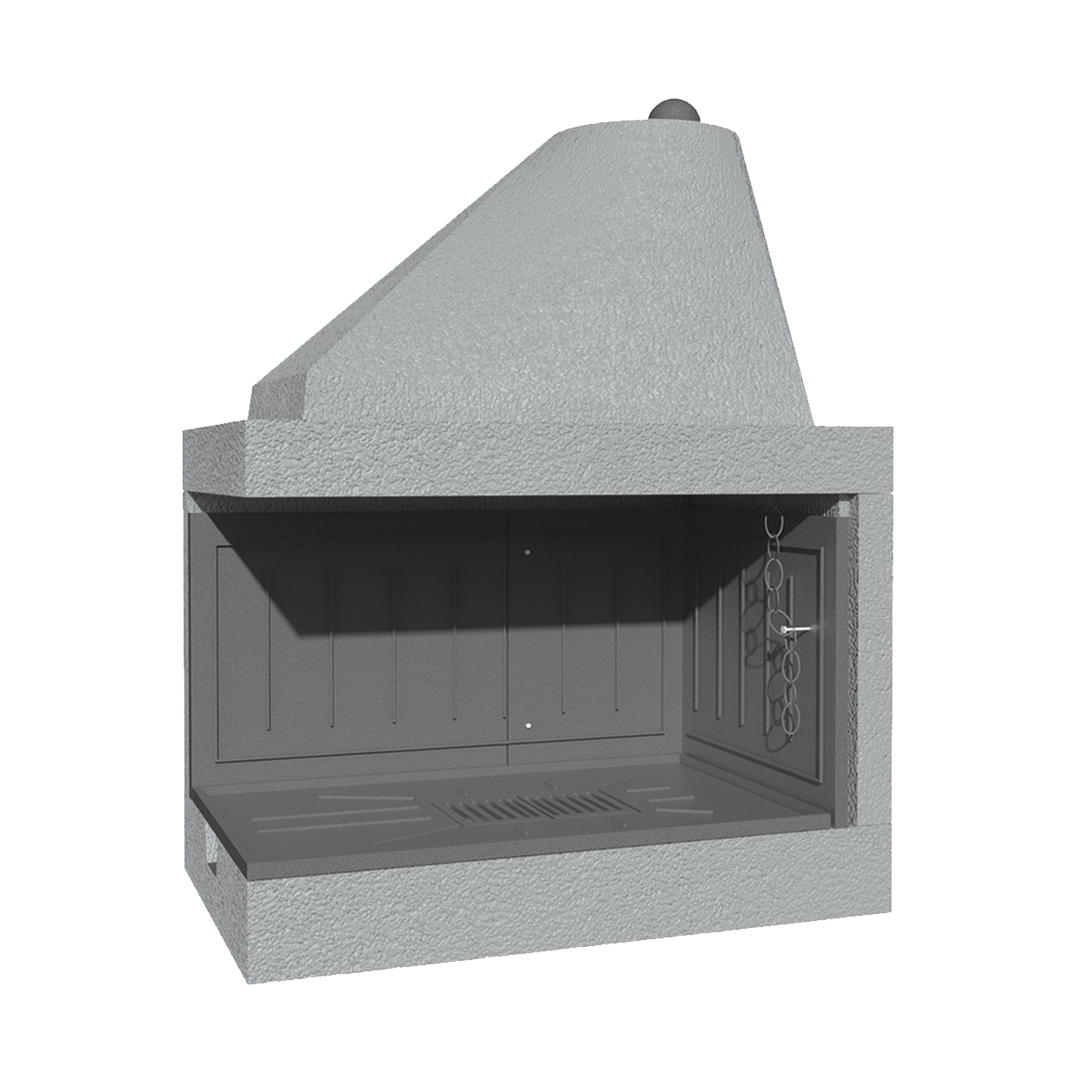 Caminetto prefabbricato a legna a focolare aperto completo di: valvola fumi, vaschetta raccogli cenere e griglia in ghisa. Struttura e fiancate realizzate in conglomerato cementizio alleggerito. Focolare realizzato interamente in ghisa (88 kg). Posizionabile sia ad angolo che a parete, adatto per la cottura di cibi ed arrosti. REVERSIBILE In fase di installazione è possibile scegliere se installare il caminetto con apertura destra o sinistra.
