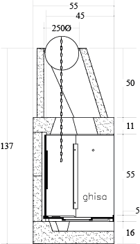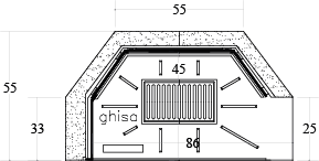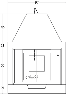 Caminetto prefabbricato a legna a focolare aperto completo di: valvola fumi, vaschetta raccogli cenere e griglia in ghisa. Struttura e fiancate realizzate in conglomerato cementizio alleggerito. Focolare realizzato interamente in ghisa (62 kg). Posizionabile sia ad angolo che a parete, adatto per la cottura di cibi ed arrosti.