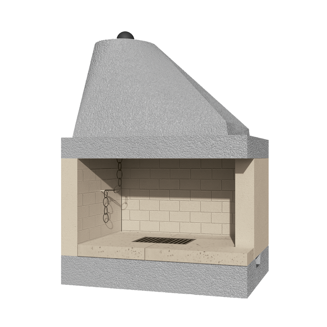Caminetto prefabbricato a legna a focolare aperto completo di: valvola fumi, vaschetta raccogli cenere e griglia in ghisa. Struttura realizzata in conglomerato cementizio alleggerito. Focolare realizzato in refrattario ad alto tenore di allumina. Posizionabile sia ad angolo che a parete, ideale per la cottura di cibi ed arrosti.