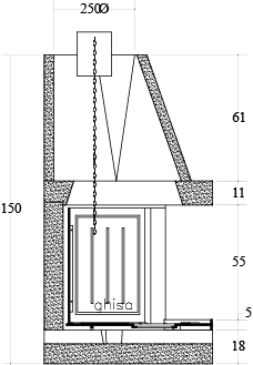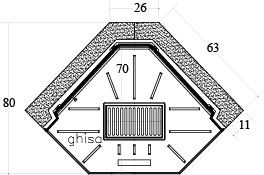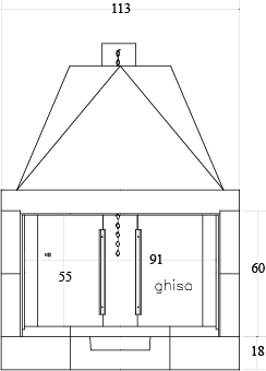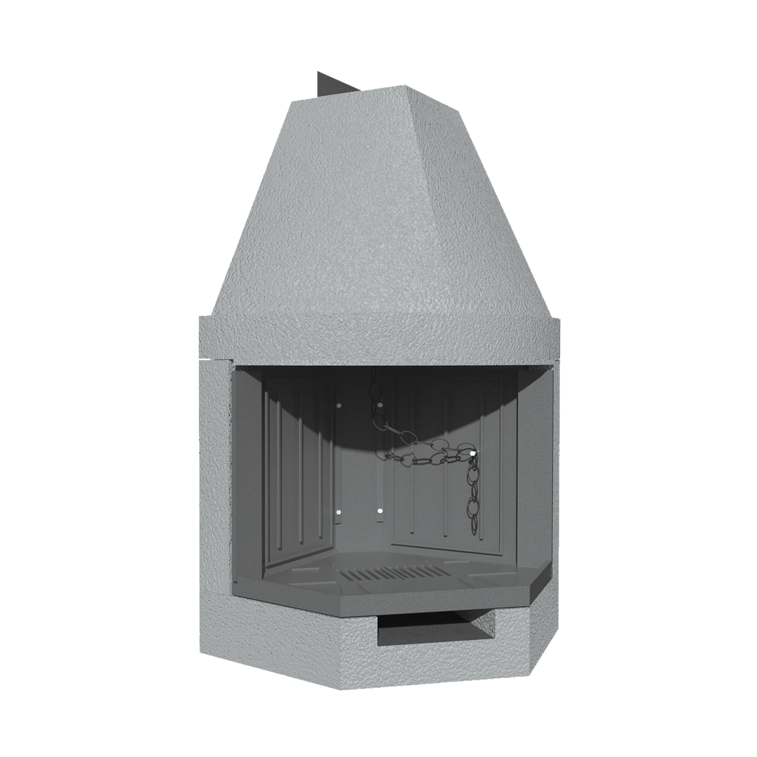 Caminetto prefabbricato a legna a focolare aperto completo di: valvola fumi, vaschetta raccogli cenere e griglia in ghisa. Struttura e fiancate realizzate in conglomerato cementizio alleggerito. Focolare realizzato interamente in ghisa (73 kg). Posizionabile sia ad angolo che a parete, adatto per la cottura di cibi ed arrosti.