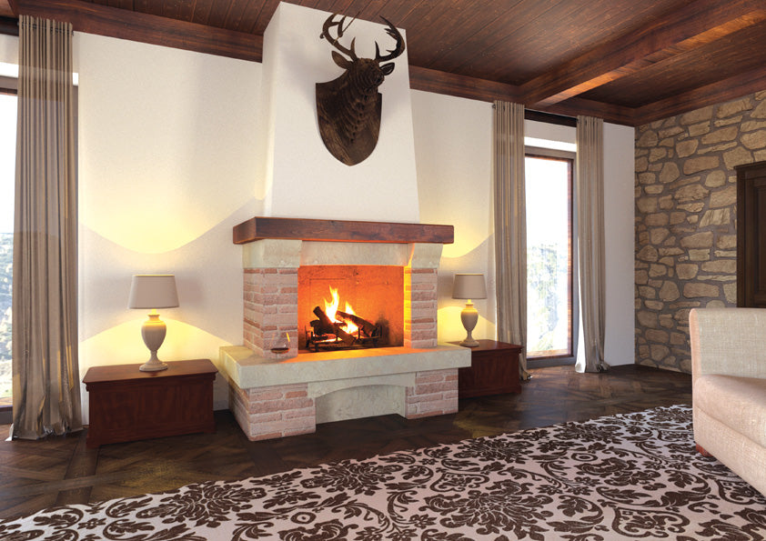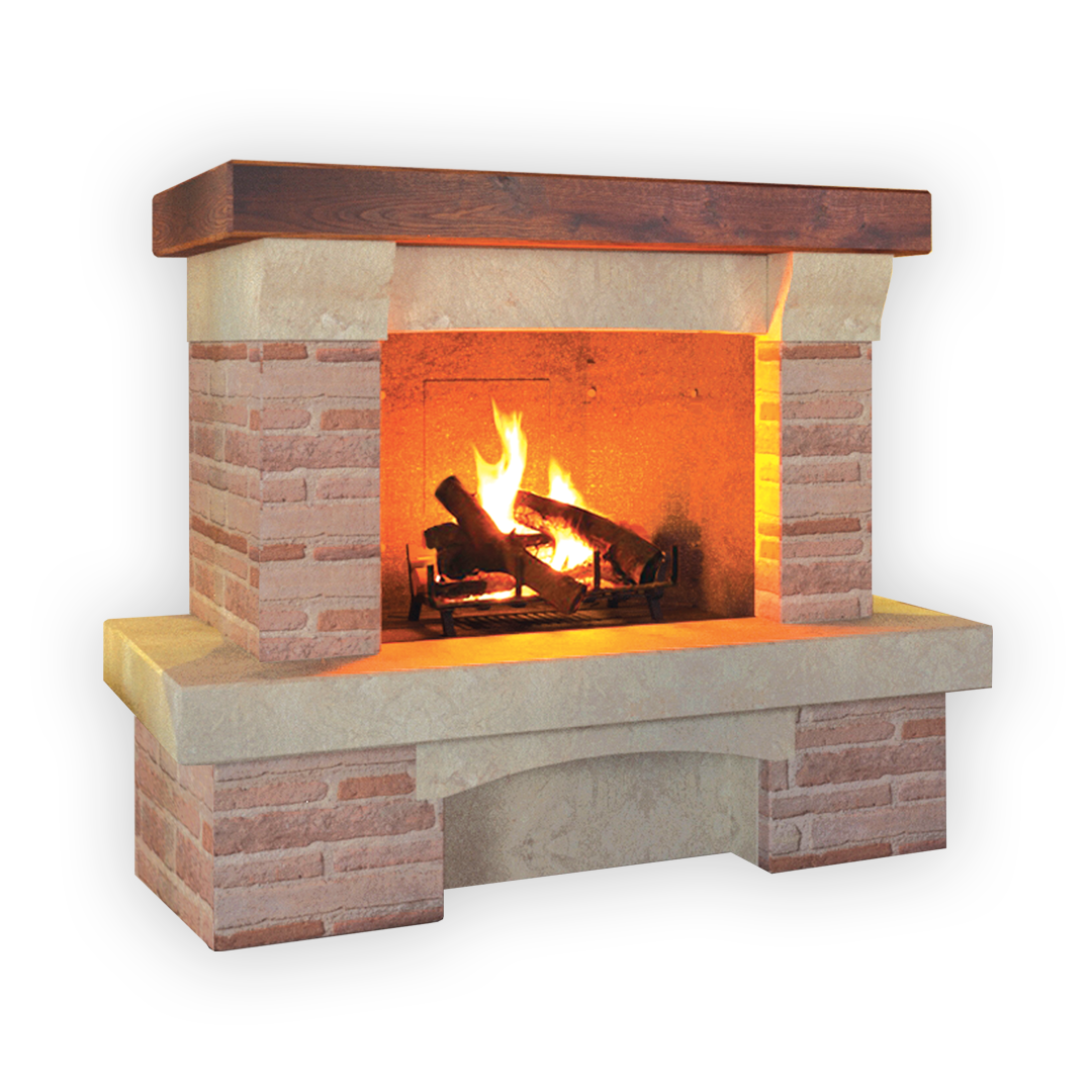 Disponibile di serie per i seguenti focolari: M 100 TGH - M 100 REF - M 110 TGH - M 110 REF In foto soglia inferiore, archetto, architrave e particolari realizzati in Marmo Perlato Svevo anticato; Sottogrado e spallette realizzate in Mattone Antico; Mensola superiore in legno lamellare spessore 12 cm.