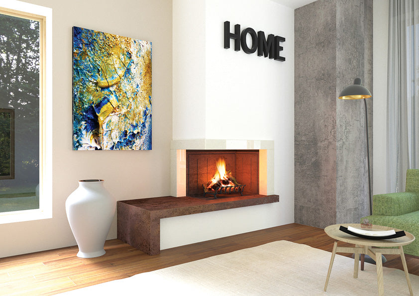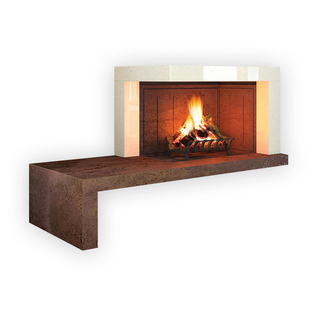 Disponibile di serie per i seguenti focolari: DS 90 TGH - DS 100 TGH - DS 90 REF - DS 100 REF In foto soglia completa di supporto laterale sx realizzata in Ceramica Metallo Corten; Cornice contorno bocca realizzata in Marmo Maljat lucido; Sottogrado con supporto di serie da rifinire e verniciare in opera.