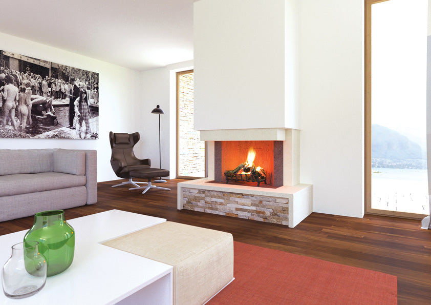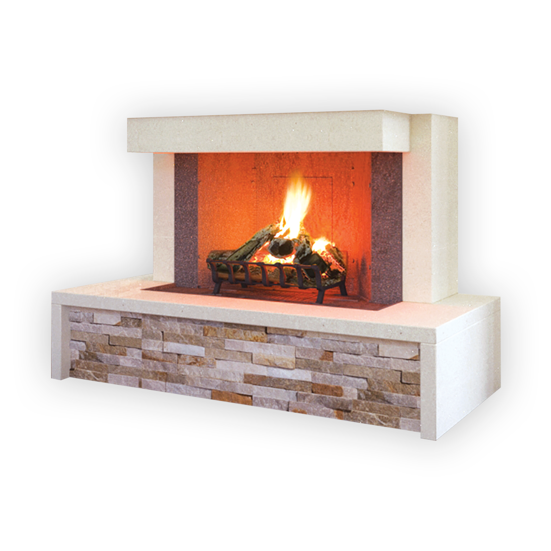 Disponibile di serie per i seguenti focolari: M 100 TGH J2L - QR 100 F2L In foto soglia inferiore, supporti, spallette ed architrave realizzati in Marmo Maljat lucido; Parte centrale del sottogrado realizzata in Spaccato Misto.