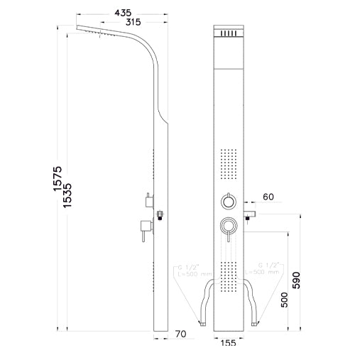 Parete attrezzata multifunzione modello Loira realizzata in acciaio inox AISI 304 cromo satinato, dimensioni L 15.5 x H 157.5 x P 43.5, nr. 4 funzioni selezionabili: soffione, doccetta e getti orizzontali superiori e inferiori.