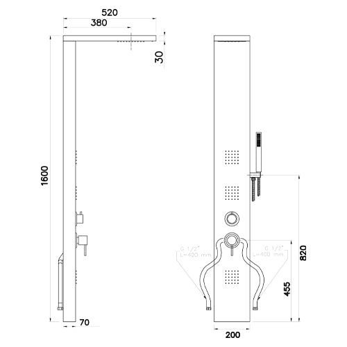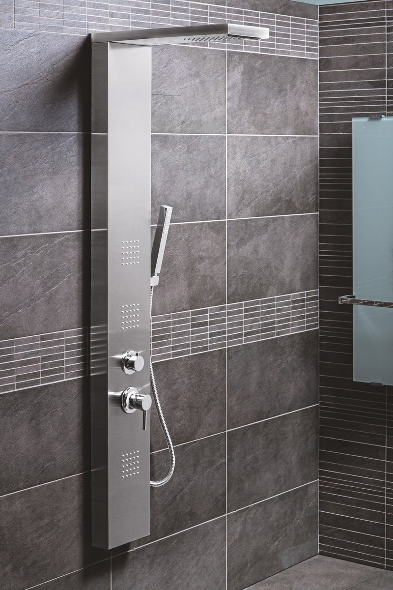 Parete attrezzata multifunzione modello Manhattan realizzata in acciaio inox AISI 304 cromo satinato, dimensioni L 20 x H 160 x P 52 cm, nr. 4 funzioni selezionabili: doccetta a mano, soffione, getto orizzontale e getto effetto cascata.