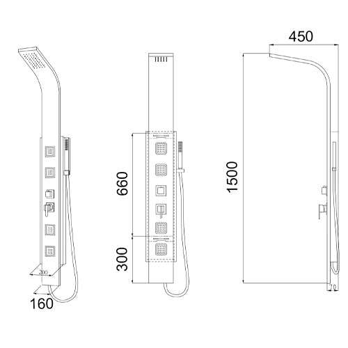 Parete attrezzata multifunzione modello Santorini realizzata in acciaio inox AISI 304 inox spazzolato, dimensioni L 20 x H 160 cm, nr. 4 funzioni selezionabili: doccetta a mano, soffione, getto orizzontale, effetto cascata con LED, completo di laccio doccia in acciaio inox.