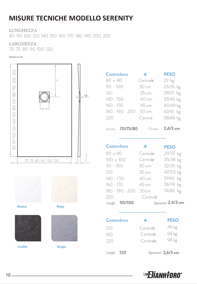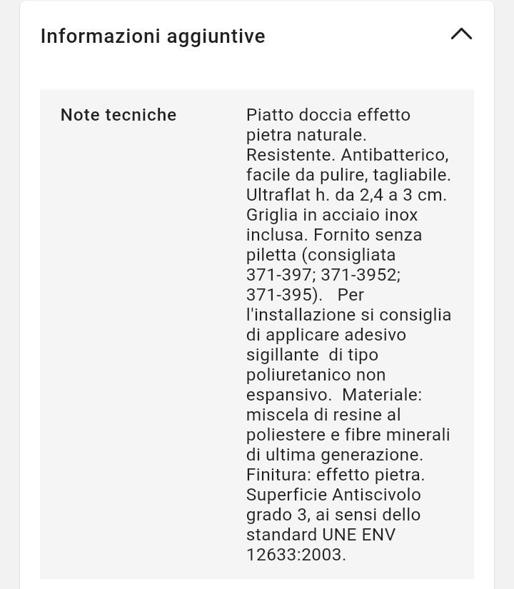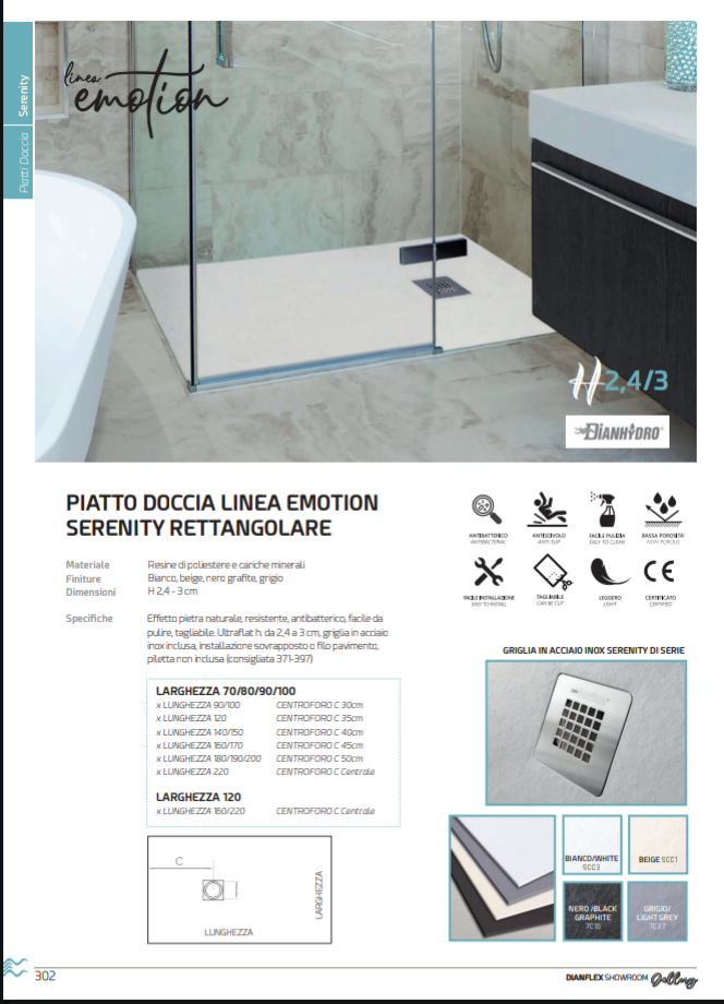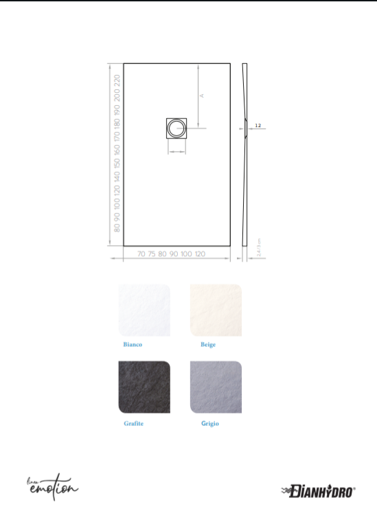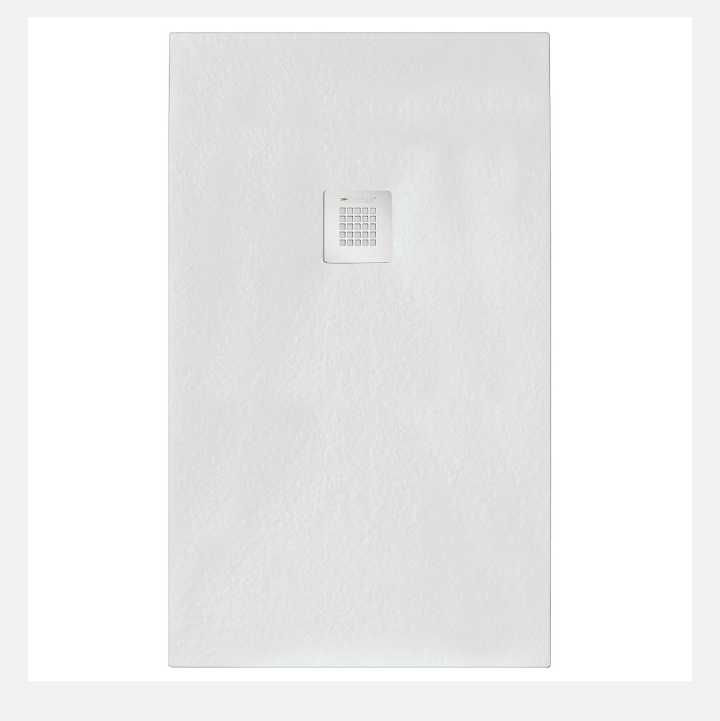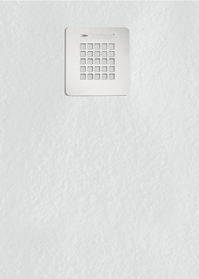 Piatto doccia effetto pietra naturale. Resistente. Antibatterico, facile da pulire, tagliabile. Ultraflat h. da 2,4 a 3 cm. Griglia in acciaio inox inclusa. Fornito senza piletta (consigliata 371-397; 371-3952; 371-395). Materiale: miscela di resine al poliestere e fibre minerali di ultima generazione. Finitura: effetto pietra. Colori: bianco (RAL 9003 - bianco segnale), beige (RAL 9001 - bianco crema), grigio (RAL 7035 - grigio luce) e grafite (RAL 7016 - grigio antracite). Superficie Antiscivolo grado 3, ai sensi dello standard UNE ENV 12633:2003.