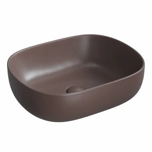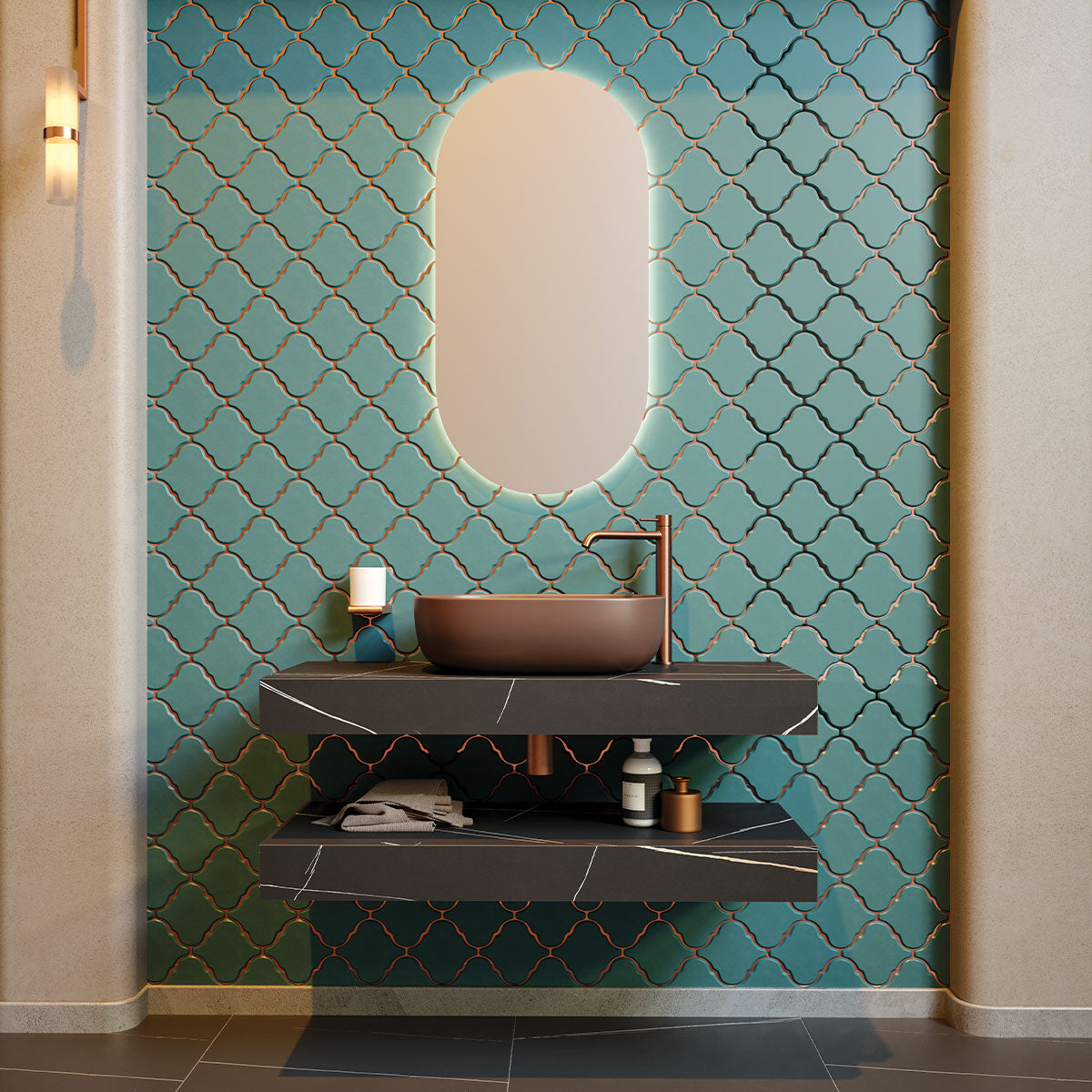 Articoli della composizione: Mensolone STEIN 100 in pietra sinterizzata Nero venato (x2) senza foro rubinetteria (foro da praticare) Lavabo in ceramica Plus A419 48,5 Brown opaco Coppia staffe L.40 (x2) Specchio Oval 45 H.90 retroilluminato led